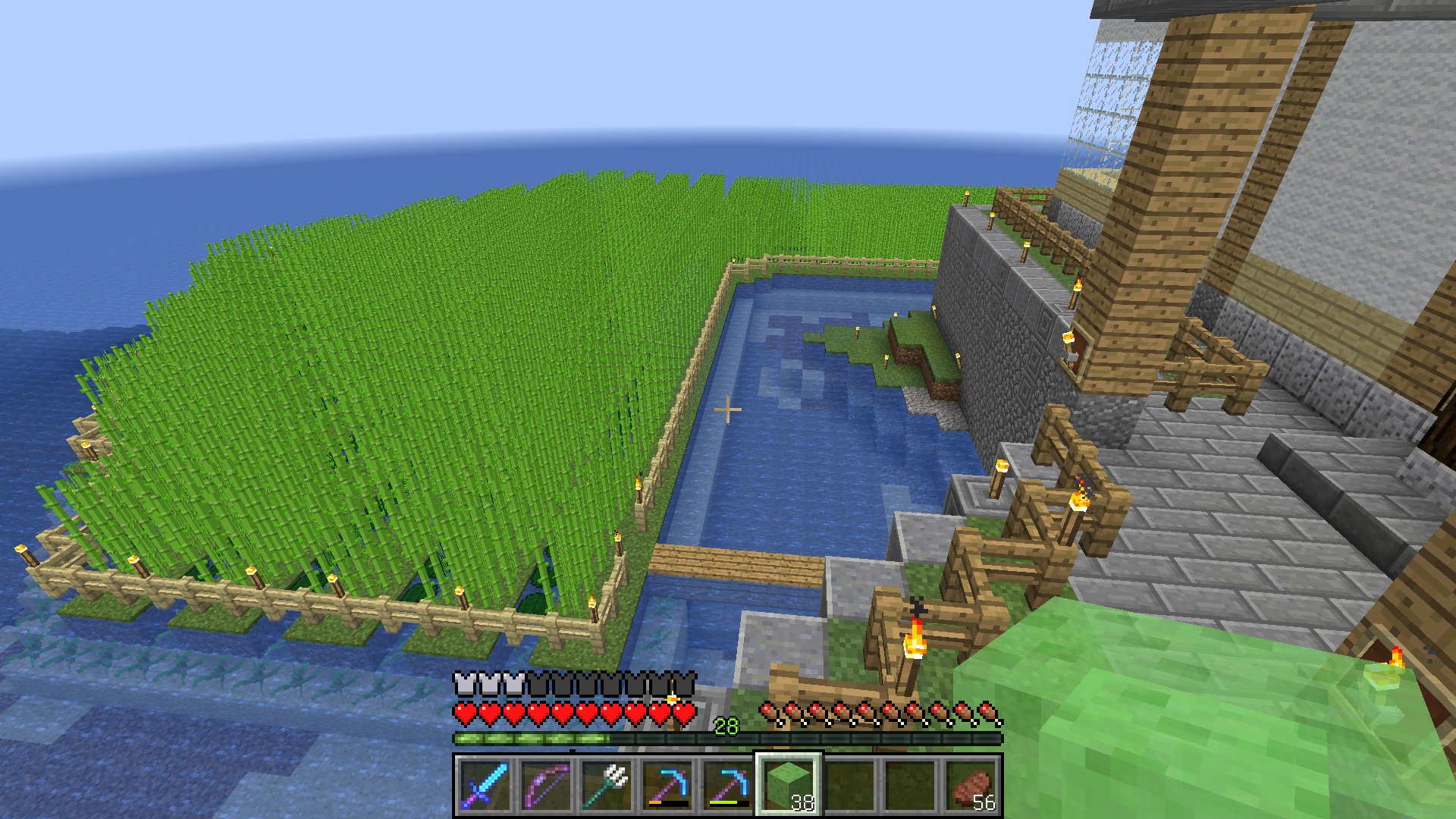はじめ人間オクタゴン 島村の倉庫 最上部は村を見渡せるようになっています W 中に入り 隠し階段から地下へ降りると海上のサトウキビ畑があります 結構気に入ってる場所です マインクラフト マイクラ サトウキビ畑 農業倉庫と展望台